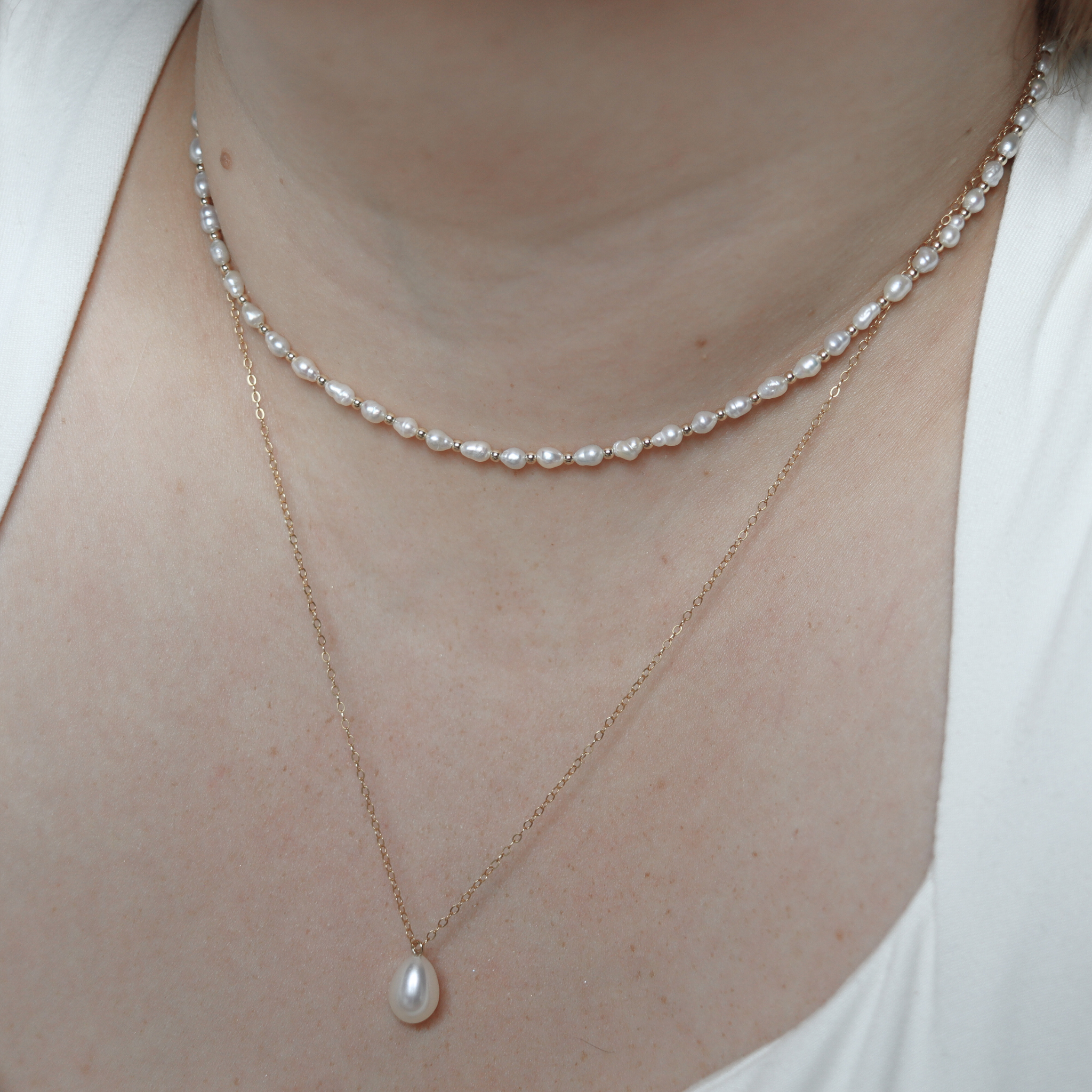 These are simple and graceful, a single strand of round pearls resting softly on the neck. They work with dresses or smart outfits. Emmrelle offers classic round-pearl necklaces in both 14k gold-filled and sterling silver, selected for their shine and quality