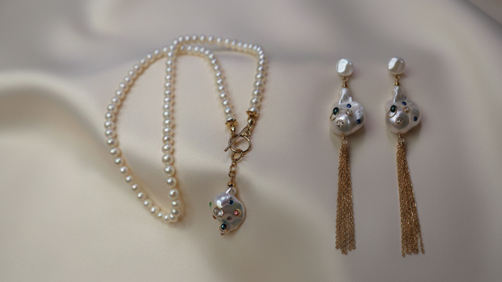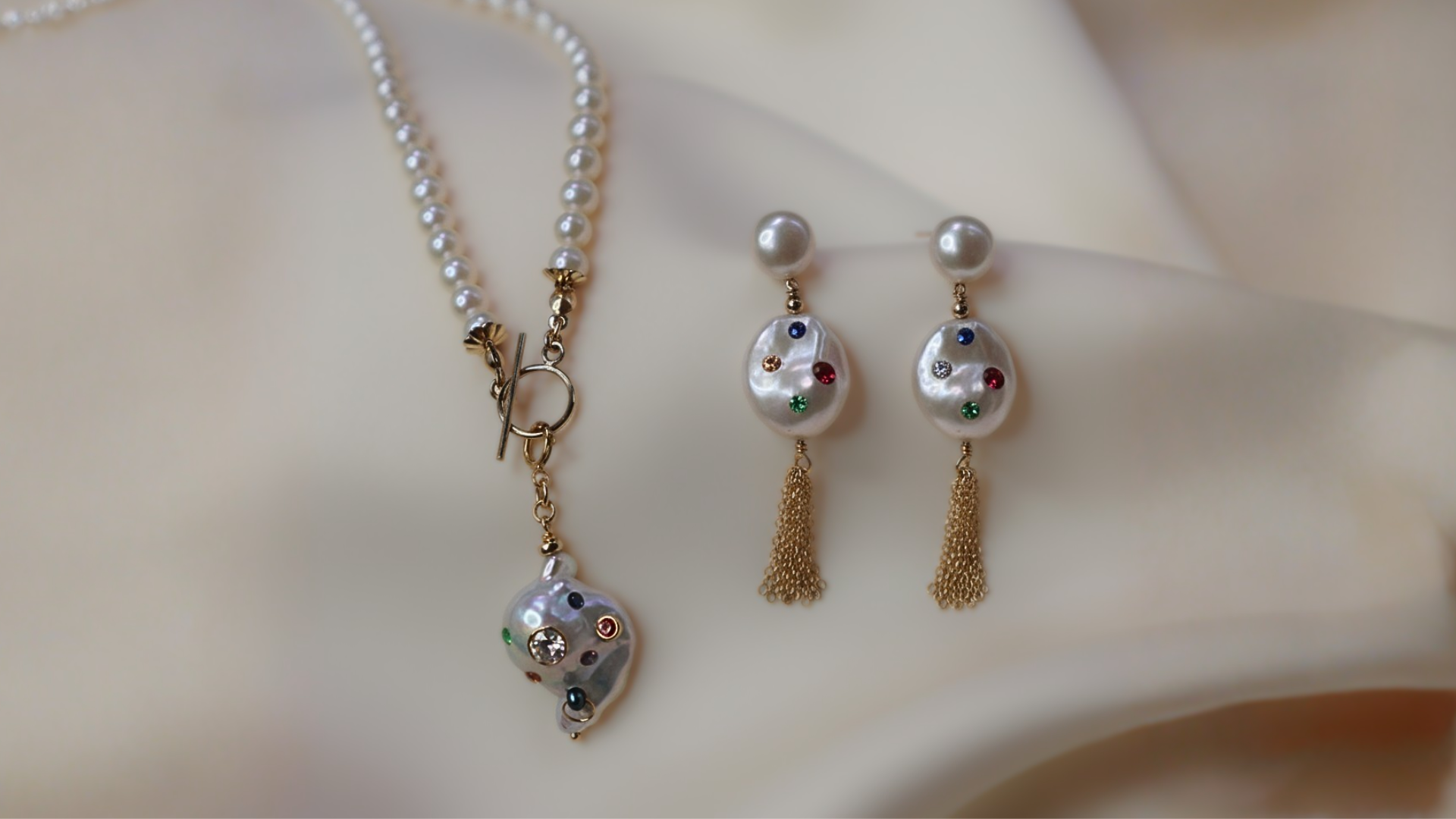 Gemmelle 3 in 1 Convertible Bejeweled Baroque Pearl Tassel Earrings