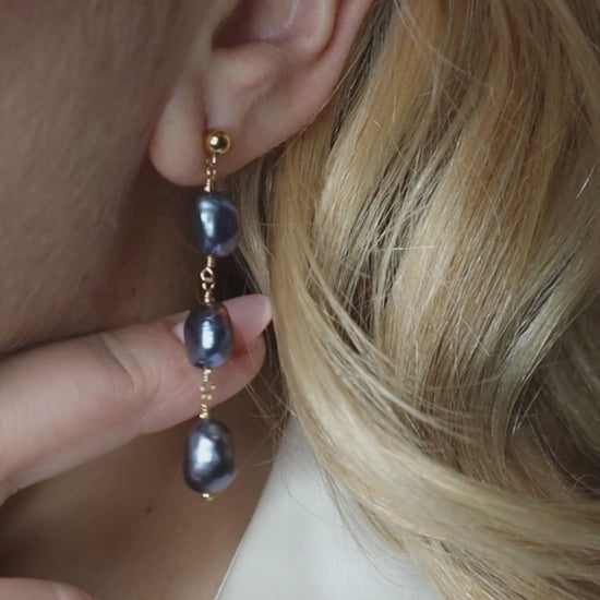 Elevate your jewellery collection with these striking drop earrings, featuring sleek ball studs paired with three cascading baroque black pearls. Each pearl showcases deep black tones with mesmerising peacock sheens that shift subtly in the light.