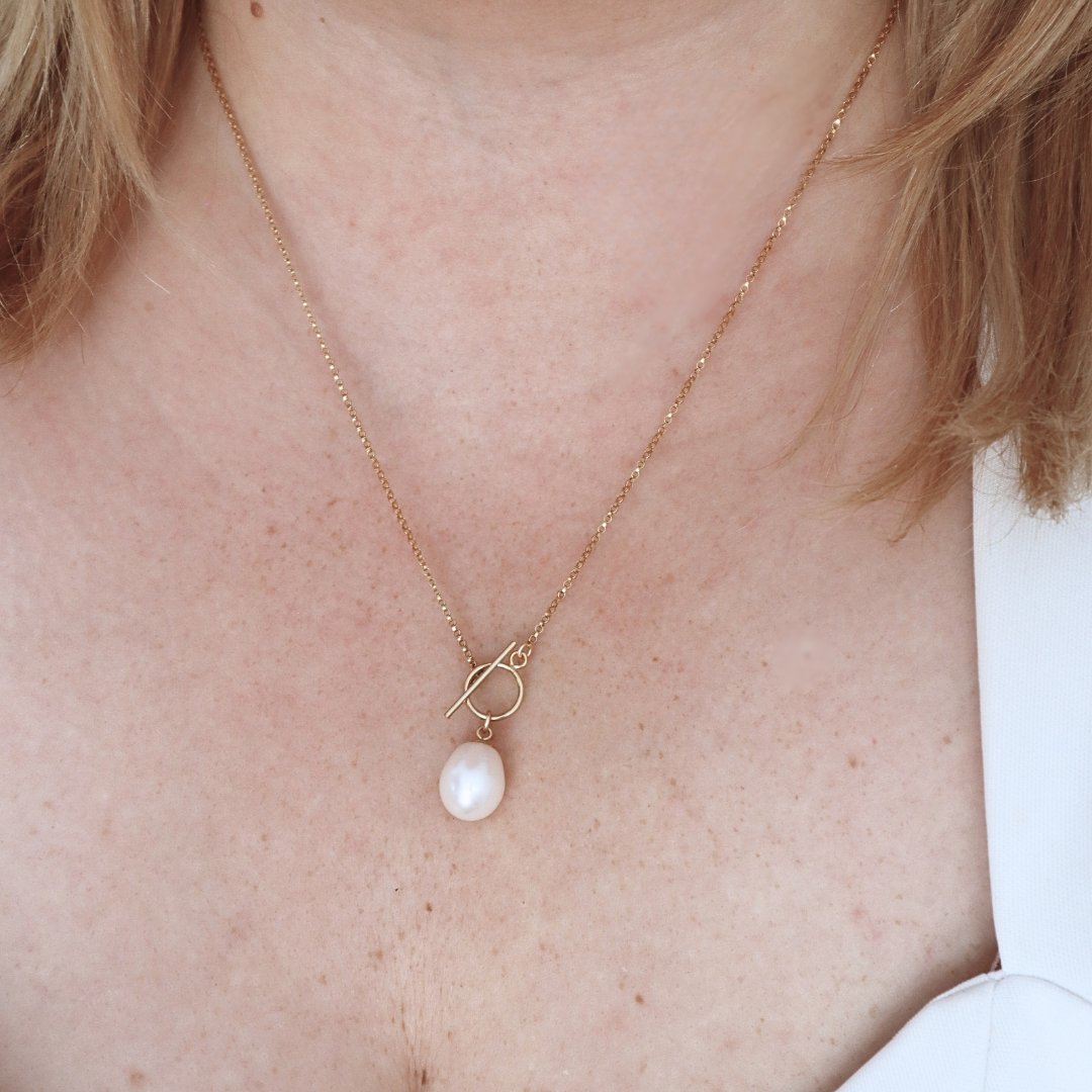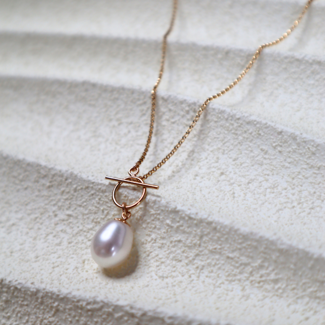 Elegantly understated, this modern necklace features a lustrous large rice pearl adorned with a delicate flower bead cap. The minimalist design is completed with a simple chain and sophisticated toggle clasp, creating a versatile piece that elevates both everyday and special occasion attire.