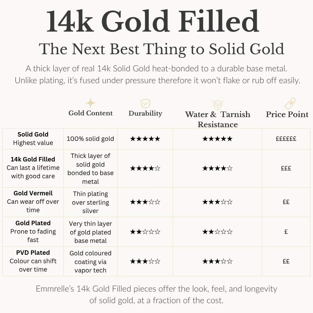 Gold-filled jewellery offers the luxurious look of solid gold with enhanced durability and affordability. Unlike gold-plated pieces, gold-filled jewellery features a thick layer of solid gold bonded to a high-quality base metal using heat and pressure, over 100 times thicker than standard plating.