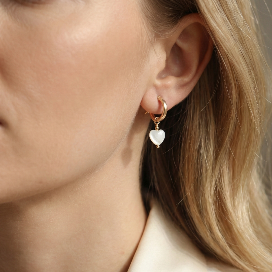 Elevate your everyday look with our Selene Heart Hoop Earrings. These delicate 13mm hoops feature a playful mother of pearl heart charm, adding a touch of fun and love to any outfit. Part of our exclusive Love Collection, these earrings are both durable and stylish, making them perfect for everyday wear.