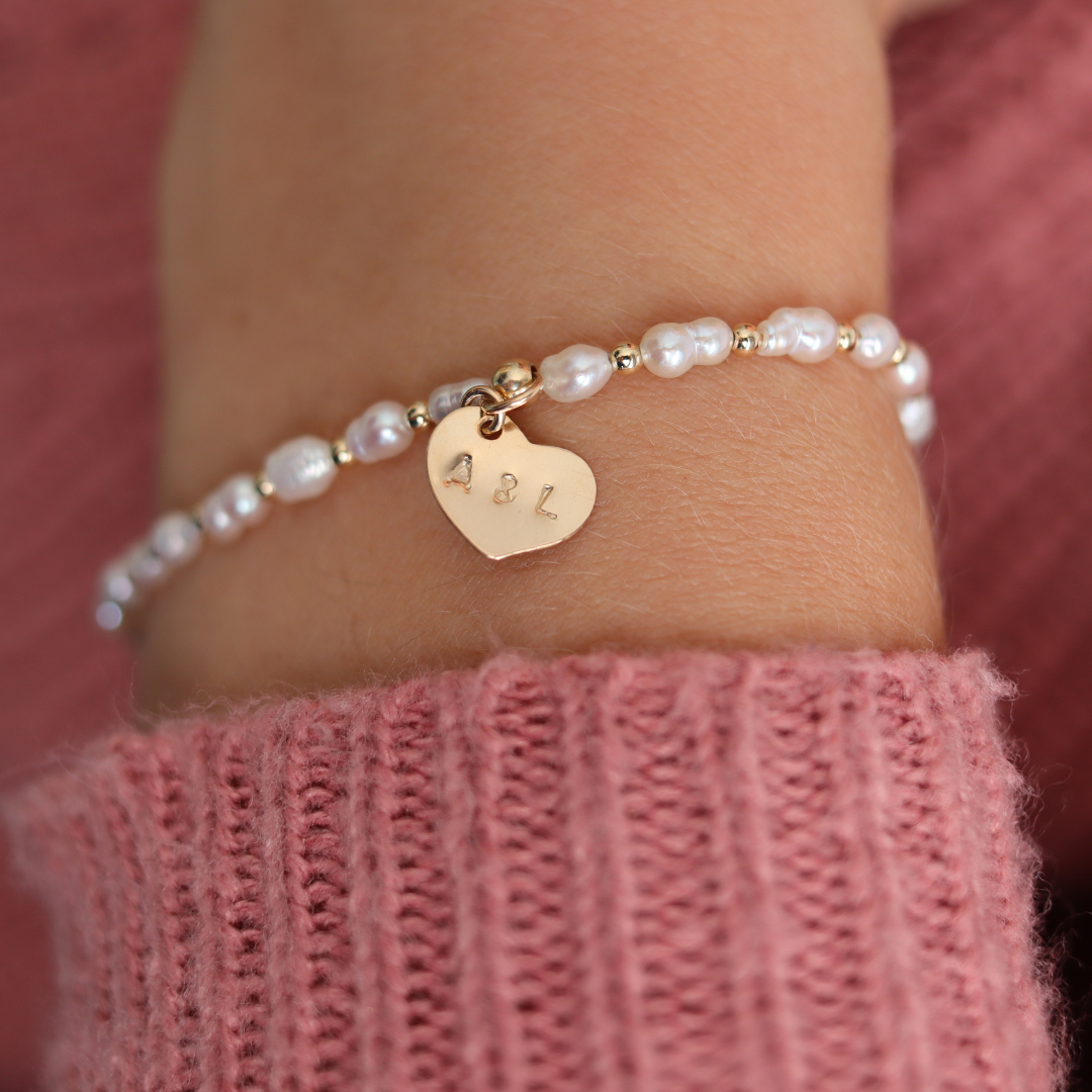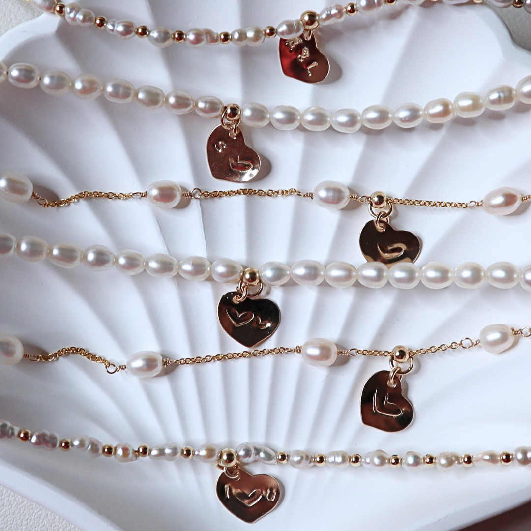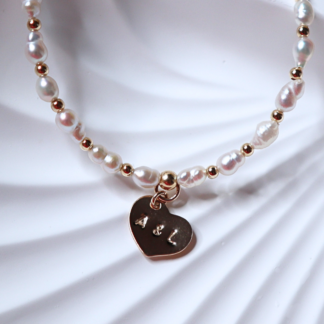 Delicate 2–3mm seed pearls are intertwined with metal beads, finished with a personalised engraved heart charm.